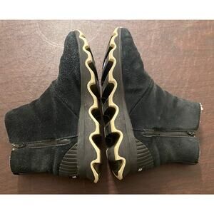 Cozy and practical Sorel Out ’N About waterproof suede booties in women’s size 7.5. Black suede exterior with warm faux-fur lining, side zippers, and the signature wavy rubber outsole for grip. Great cold-weather everyday boot with classic Sorel comfort.