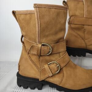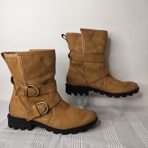 Sorel Phoenix Moto Boots Women's size 11. Soft Nubuck Suede, Sheerling & Microfiber Lined. Light Brown/Tan. Waterproof. 1" heel. Wear up at about mid-calf or rolled down.