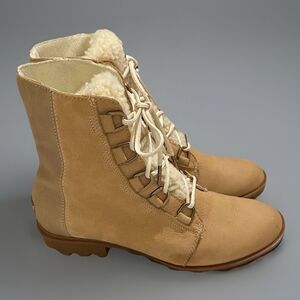 Sorel Phoenix Short Lace Lux Womens Leather Boots Worn Only a Few Times! Natural Tan Leather Size 10 Shearling Tongue Waterproof Great for any Cold Weather activity like working or playing in the snow with the kiddos. LUX & Combat, Moto-Inspired Key features and benefits of the Sorel Phoenix: Waterproof: Designed to resist water and keep your feet dry in wet conditions. Comfort: Features a plush EVA footbed and soft lining for a comfortable fit. Traction: Molded rubber outsole provides good grip on various surfaces. Versatile: Can be worn casually or with more dressy outfits. Easy on/off