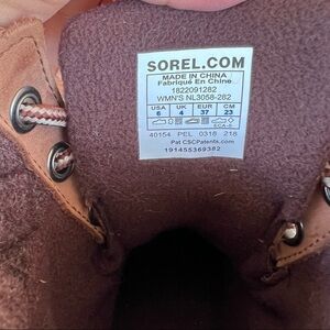 Sorel Slimpack Lace Leather Winter Snow Boot-Women’s Size 6. Color is Tan/Black. Good preowned condition with light wear from normal use. They have some scuffs/marks on them.