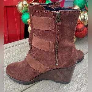 Sorel After Hours boots. Loosely inspired by trends of thr 1970s. Waterproof suede upper. 3 straps with webbing hook buckles. Zip close on inside of shaft - zippers in great working order. Rubber sole with little-to-no loss of tread depth. Original insoles. 3.29” wedge heel. 0.44” platform. Overall good/very good used condition. There are some small cosmetic blemishes, shown in pictures.