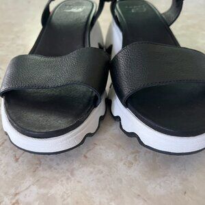 Sorel sz 8.5 women's Kinetic Impact adjustable sandal. Leather upper with velcro adjustable ankle strap. Leather cushioned footbed. Platform sole with black and white rubber outsole. Red Sorel logo tag for a color pop. Vibrant sandal that's also super comfortable! In excellent condition, very few signs of wear. Clean upper, insole, and outsole. Fits true to size.