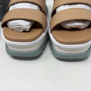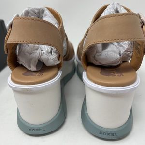 Stylish Sorel sandals with a tan upper. Features a white platform sole. Adjustable buckle strap for a secure fit.