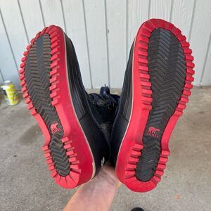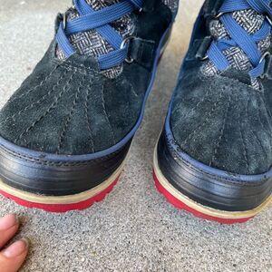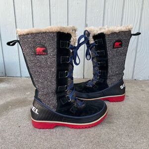 Stay cozy and stylish in these Sorel Tivoli High boots, perfect for winter adventures. Featuring a sophisticated gray herringbone fabric, black suede accents, and a striking red rubber outsole, these boots combine function and fashion. Fully waterproof with faux fur trim and fleece lining, they ensure warmth and dryness during cold weather. The lace-up design provides a secure fit, and the rugged traction outsole offers stability on slippery surfaces. This is a very popular style that is no longer available.