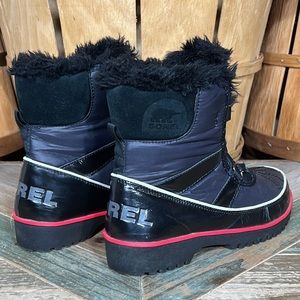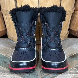 Previously loved in great condition! A smidge of wear on uppers and soles with tons of life left. Black/red colorway, insulated, faux fur, waterproof winter boots!