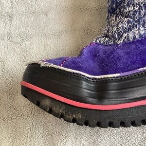 Good-to-fair used condition. Tivoli II Suede Boot by Sorel in purple with pink, black and white detailing. Great for light snow and rainy outdoor weather. Stylish mid-cut pull-on winter boot with metallic knit fabric and waterproof soft, pliable suede upper. Lined with fleece and trimmed with faux fur, see video. Removable molded EVA footbed. Molded rubber sole. 100g insulation. Note: light wear to bottom sole with minor streetwear and moderate rubbing to suede upper and fabric at piping, see photos. Youth design in women's sizing. Size 6, see photos for measurements.