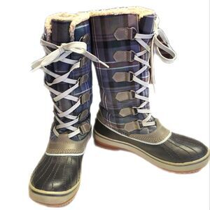 Sorel Tivoli Waterproof blue & brown plaid duck boots, size Wm's 6
