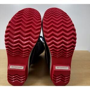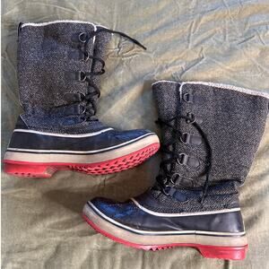 Boots are in great condition, lightweight, waterproof and warm. Great from fall, winter and even spring! Black Chevron like pattern with coral/reddish accent bottom and logo on side. Tie up laces. MA