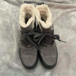 UPPER: Waterproof full grain leather upper with shearling collar and synthetic overlays. Genuine wool lining. Waterproof seam-sealed construction. Laces are not waterproof.