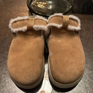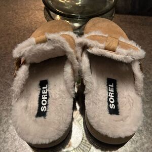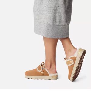 Sorel Viibe Cozy Faux Fur Suede Clogs in Tawny Buff and Natural