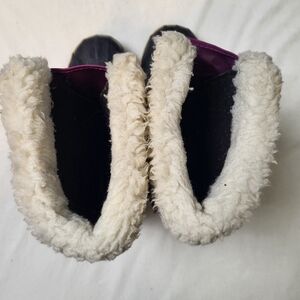 Stylish winter boots in purple and black. Features cozy sherpa lining and durable soles. Perfect for cold weather. Waterproof. Size 7.