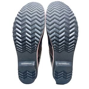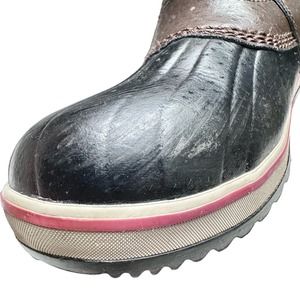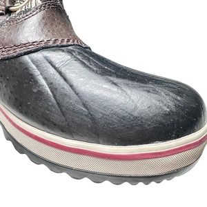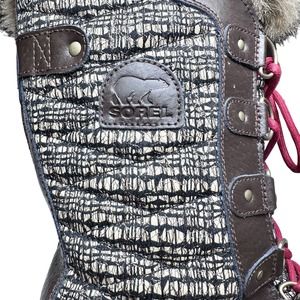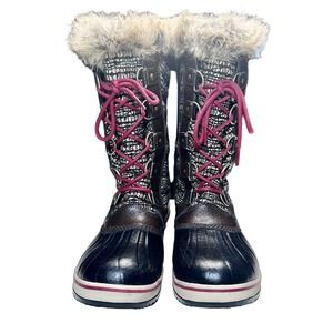 Pre-owned women's Sorel Tofino II mixed metallic textile, leather, and faux fur trim waterproof winter lace up duck boots.
