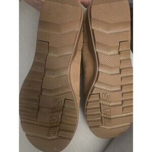 Step out in comfort and style with these Sorel Out N About wedge booties in a versatile camel brown suede. Featuring a sleek side-zip closure, cushioned wedge sole, and signature Sorel tread for excellent traction, these boots are perfect for fall and winter wear. The suede uppers are in great used condition with minimal wear, and the soles are excellent with plenty of life left.