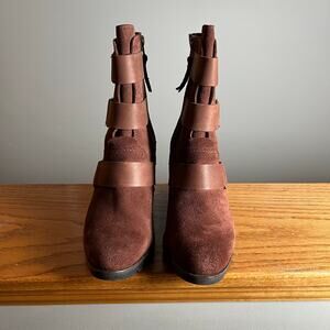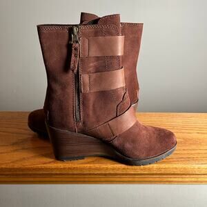 Step out in style with these gorgeous Sorel After Hours suede booties! These size 8.5 brown ankle wedge boots are in excellent condition and come from a smoke-free home. Perfect for adding a touch of chic to any outfit, the leather strap detail elevates the look.