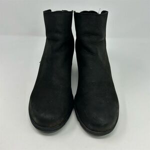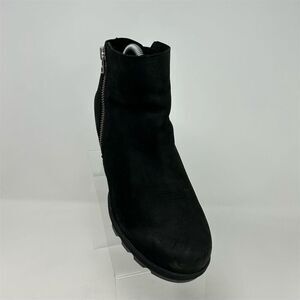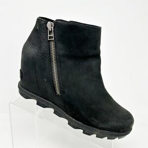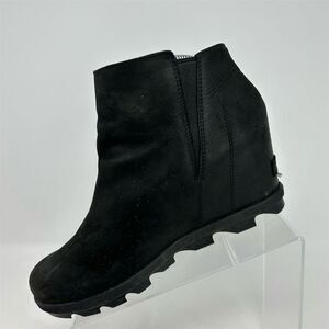 Keywords: Sorel boots, women's booties, black leather boot, waterproof wedge boot, casual fall footwear, mid heel boot, side zip boot, lugged sole boot, closed toe boot, pre-owned women's shoes, Sorel Joan Of Arctic, leather bootie, women's size 9.5, UK size 7.5, EU size 40.5.