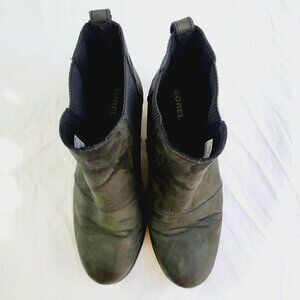 Sorel Women's Black Waterproof Leather Joan of Arctic Wedge II Chelsea Bootie - size 9 - GUC (moderate wear to leather with some scratches and dings at toes - see pictures)