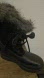 Cozy and rugged winter wedge boots by Sorel. Features black leather and gray faux fur trim. Ideal for cold weather adventures.