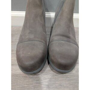 Sorel Women's Evie Bootie Pull-On Ankle Boots for Ladies Quarry/Gum Sz 8.5. Please see attached pictures for condition. There are natural scuffs in the leather on each shoe. A few small spots on the suede section of each shoe. The bottoms are in excellent condition. Please let me know if you have any questions. Thanks for looking!