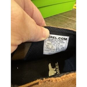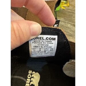 The Sorel Women's Evie Leather Wedge Ankle Boot in Suede Leather Brown Tan, size 7.5, is a stylish and versatile boot perfect for the modern woman. With a comfortable wedge heel and round toe shape, these boots are easy to slip on and off with their pull-on closure. Made of high-quality leather and featuring a canvas lining, they are durable enough for everyday wear. The tan color and ankle height make them suitable for outdoor activities, while the preppy cowgirl theme adds a touch of flair to any outfit. Whether you're running errands or heading out for a night on the town, these Sorel boots are sure to be a fashionable choice. Minor scratches from shipping. See photos. 22219. 122226.