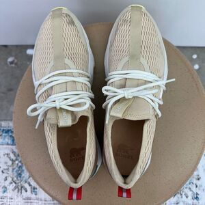 UPPER: Breathable mesh in a bootie construction with lace detail for a secure fit. Webbing detail down vamp with a pull tab in heel and front collar. Leather rand with SOREL logo.