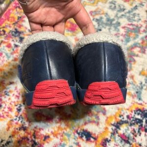 Stylish navy mules with white trim. Comfortable and warm. Perfect for casual wear.