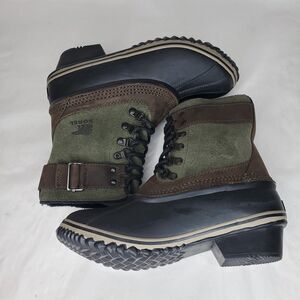Sorel Womens Size 8 Winter Fancy Lace II Suede Boots, NL2125-213, 1571561213. Dark green, brown, and black colorway. Boots are new, no tags or box. The Sorel boots feature seam-sealed waterproof construction, upper waterproof full-grain leather, fleece lining, 100g insulation, molded EVA footbed with arch support, microfleece topcover, vulcanized rubber midsoles, insulated waterproof vulcanized rubber shell with herringbone outsoles, shaft eight: 7 in., heel Height: 1 1/2 in., calf circumference: 13 in., Platform Height: 1/2 in. The retail price on these sold out boots was $150. If you have any questions or need additional photos, please reach out before you purchase. Ships with care same day or next business day