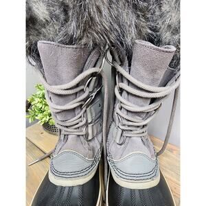 The Sorel Women's Size US 9 Joan Of Arctic Boots in Quarry/Black are a stylish and functional choice for the winter season. These lace-up boots feature a round toe shape and low heel height, making them comfortable for casual wear or travel. The waterproof and insulated design ensures warmth and protection against the elements, while the faux fur trim adds a touch of coziness. Perfect for snow, cold weather, and ice, these boots are a must-have for a winter wardrobe.