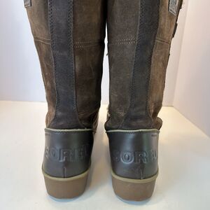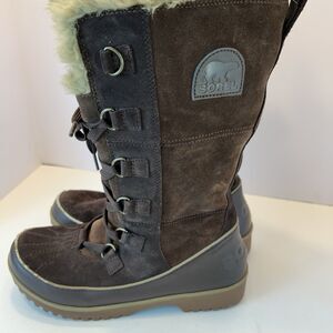 The Sorel Women's Tivoli High II boots in size 10 are stylish and functional winter footwear. Made with suede material in a classic brown color, these snow boots offer both comfort and durability. Perfect for cold weather, these Sorel boots are a must-have for any woman looking to stay warm and stylish during the winter season.