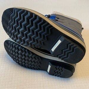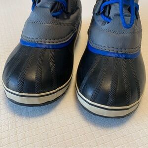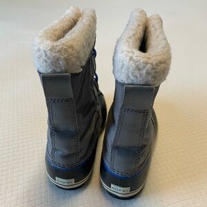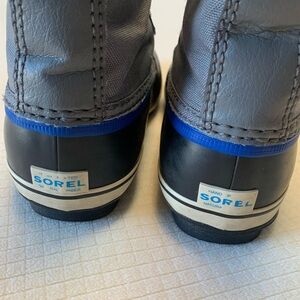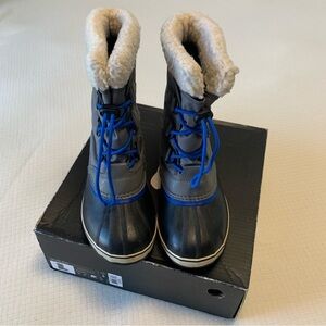 City grey “Yoot Pac Nylon” duck boots from Sorel. Sturdy blue nylon laces with pull tab closure. Waterproof. Duck boot base has coordinating blue accent. Shearling trim. Textile of interior provides warmth and comfort. Brand tags on sides and back. Slip resistant manmade soles. Grey faux leather detail along backs. Unisex. Size 6Y; fits TTS. Comes with original box. Worn for 2 winter seasons. Well cared for. Great condition! HL:25