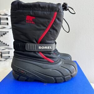 The Sorel Youth Winter Boots in Black with Red accents and size 3 are perfect for active boys. These heavy-liner snow boots feature a round toe shape, drawstring closure, and moderate cushioning level for added comfort during winter activities like walking or sledding. The waterproof, insulated, and rubber outsole make them ideal for outdoor adventures in cold weather. The nylon upper material, fabric lining, and rubber cleats provide durability and stability, making these boots a reliable choice for keeping your little one warm and stylish during the winter season.