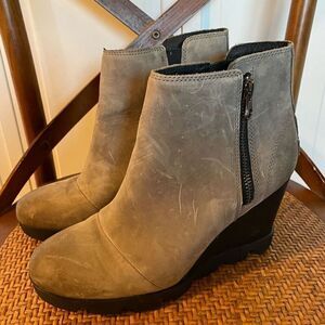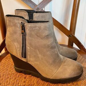 Womens Sorel wedge boots with side zipper/ leather upper and 2.5” wedge heel. Gently worn condition.