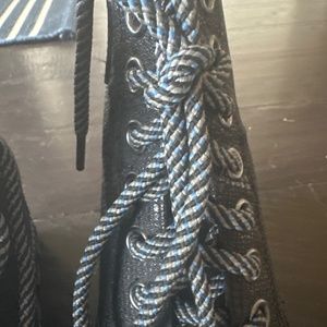 Boots worn one time . Blue and grey laces - lace up black boot by sorel