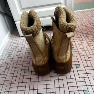 high-quality water and weather proof leather and faux fur snow boots. made in Canada and built to last and withstand any conditions. there is some light staining throughout the shoes but no major wear.