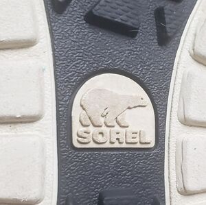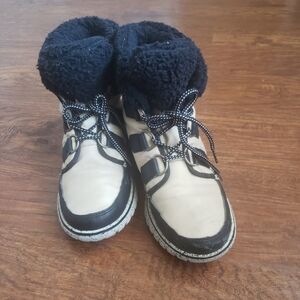 Sorel fleece Womens Leather Cozy Carnival Waterproof Ankle Boots cream Black Size 8, midsole is white with black dots, black fleece interior,