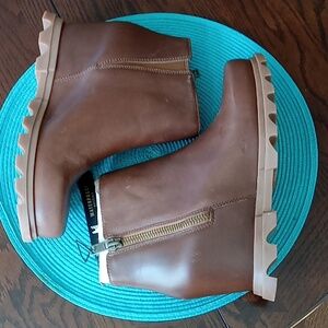 Joan of Arc III zip boots. Color is described as Hazelnut Leather/Gum. See photos for color and also note that the leather upper has some markings common to full-grain leather.