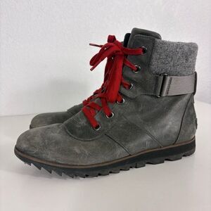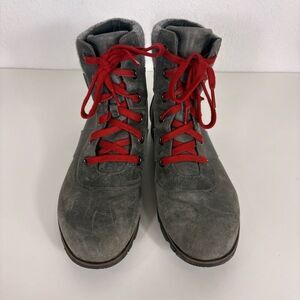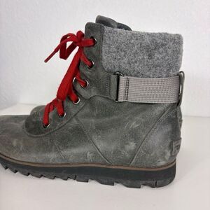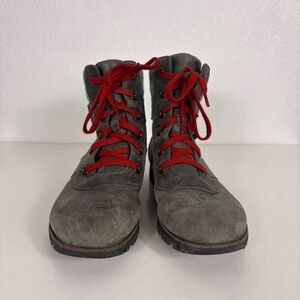 Good condition Sorel Grey Leather Red Lace Up Mid Calf Boots Women's Size 10.5