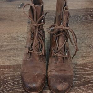 Chic brown lace-up boots with wedge heel. Ideal for versatile wear. Durable and stylish.
