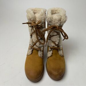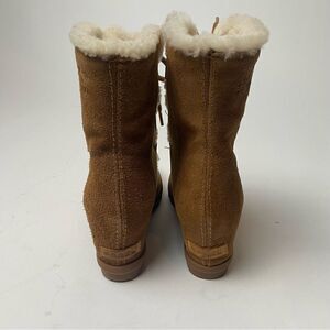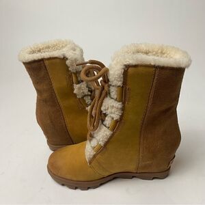 Sorel Joan of Arctic Mid Lace Up Wedge Elk Camel Brown Leather Shearling 9.5