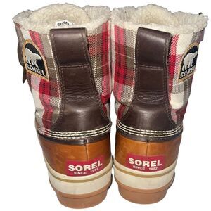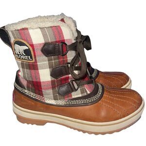 Sorel Tivoli Leather & Shearling Tan & Red Plaid Short Duck Boots - Size 6