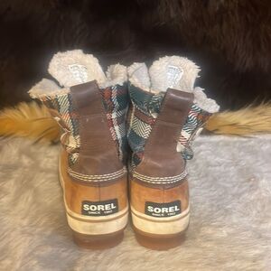 Nice booties with almost no wear on the soles. Please see last two photos for some damage on the back heels were the material is pulling away from the leather back.