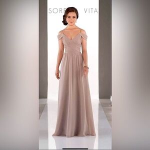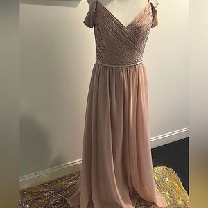 Sorella Vita Elegant boho style gown. Delicately Ruched. The bodice of this gown crosses in front , creating a slight v neck that is accentuated with skinny straps and off the shoulder straps . A thin ribbon accentuates the waist. Then flows gracefully into a light -as-air skirt. Size 10. Excellent condition. Color is Desert Rose. Amazing dress for wedding, prom , black tie! 8422