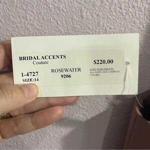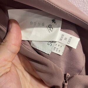 Tags still attached. Maxi dress. Style 9206. Rosewater Blush Pink. Zips in back. Faint hole in seam from trying on easy to fix with sewing machine. Just tried on otherwise excellent condition