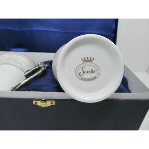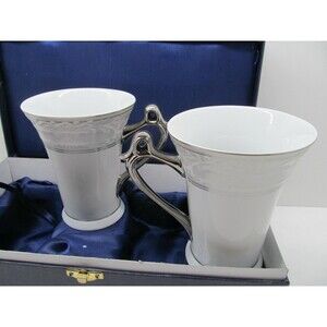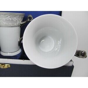 Sorelle Fine Porcelain 4 3/4"x3 3/4" Coffee Mugs Gift Box Set Of 2 Mugs Silver/White Floral Scrolls, Platinum trim .Pre Owned. Unused. Mugs Are In Excellent Condition. No Issues. Box Was Displayed And Handled But Is Also Presentable But Not Perfect. It Will Be Professionally Packaged And Fully Insured. It Comes From A Smoke Free Environment. Made In Italy.