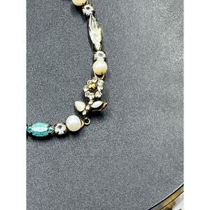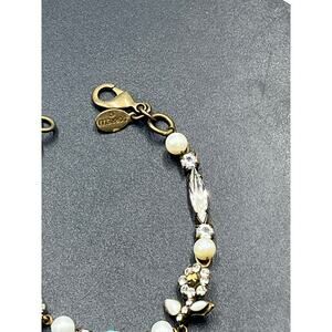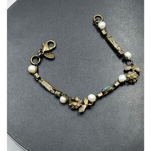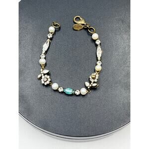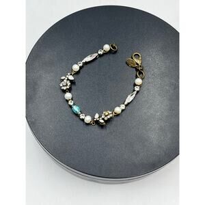 This is a sorrelli bracelet with a combination of crystals, including a turquoise-colored stone and pearls, set in an antique-toned metal.