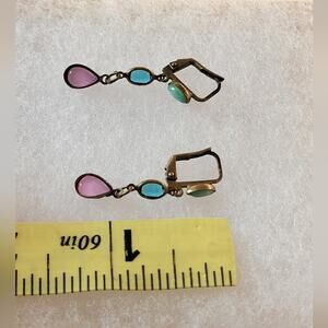 Add a pop of pastel sparkle with these stunning Sorrelli dangle earrings! Featuring pink teardrop crystals paired with aqua and mint oval stones, these earrings bring a dreamy vintage vibe to any outfit. Set in antiqued gold-tone metal with lever-back closures for secure wear. Gently loved with some light tarnishing on the metal, as shown in photos.