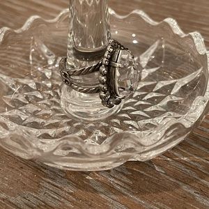 Sorrelli statement ring. Pear-cut with halo. All clear stones and antiqued silver finish. Adjustable band.