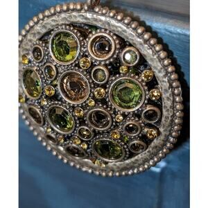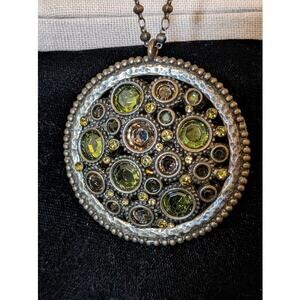 Sorrelli Multi Color Swarovski Crystal Round Pendant Vintage Inspired Long Bead Chain Necklace. Back and front of pendant are identical. Beautiful green, gold crystals adorn this gorgeous pendant. I couldn't capture the brilliance of these crystals so it is so much prettier than in the photos. Alot of sparkle. A prized piece by those who collect Sorelli. Pre-owned, this necklace is in excellent condition. Quality made. Chain measures 26" long.