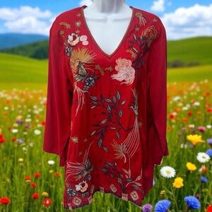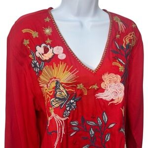 Sorrento Floral Butterfly Embroidered Boho Peasant V-Neck Blouse Size L