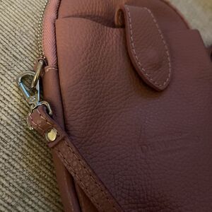 This elegant crossbody bag features a smooth leather finish in a soft pink hue, complemented by a classic flap closure. Its compact and structured design is perfect for carrying essentials, while the adjustable shoulder strap ensures comfortable wear. *NWOT 8X6.5