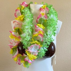 Includes: 2 cloth Hawaiian flower lays, Bikinicoconut bra (real coconut shell brand new with tags attached to bra) ties on, grass skirt (man made materials used with some wear) with flower accents on the elastic waist band (flowers on the grass skirt originally lit up but no longer work) waist band is elastic. Perfect for themed parties like luau‘s or for easy go to costume for Halloween, or if you are going away to Hawaii!